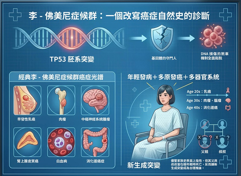 李-佛美尼症候群(LFS)是一種由 TP53 胚系突變所造成的高度致癌體質。TP53 被稱為「基因體的守門人」,一旦失能,細胞會對 DNA 損傷的煞車機制便全面鬆脫。經典李-佛美尼症候群 的癌症光譜包括:早發性乳癌、肉瘤、中樞神經系統腫瘤、腎上腺皮質癌、白血病、消化道癌症。