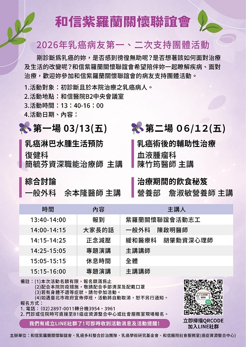 和信紫羅蘭關懷聯誼會將於 3月13日(五)舉辦2026年第一次乳癌病友支持團體活動。本次活動聚焦於「乳癌淋巴水腫生活預防」與「綜合討論」,協助初診斷並於本院治療的乳癌病友,提早認識治療後可能面臨的身體變化,並學習實用的自我照護方式。