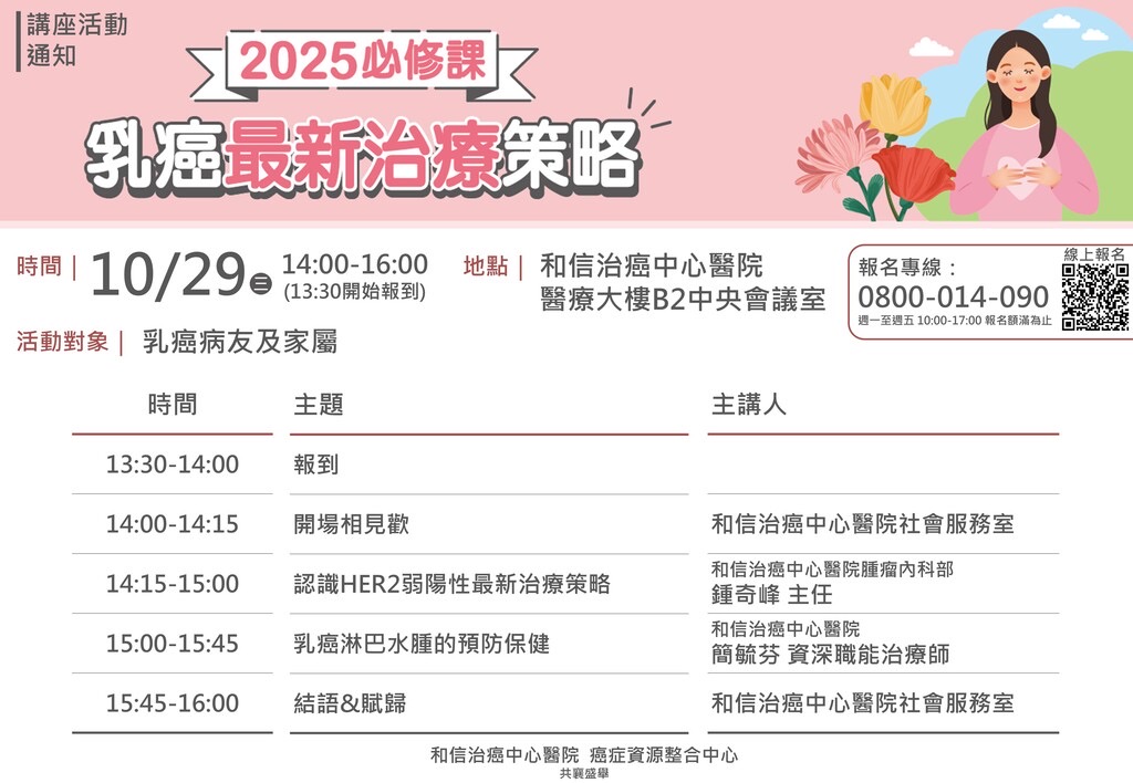 演講主題:「認識HER2弱陽性最新治療策略」及「乳癌淋巴水腫的預防保健」講者:腫瘤內科部鍾奇峰主任 及 簡毓芬資深職能治療師時間:2025/10/29(三)13:30-16:00地點:本院醫療大樓 B2 中央會議室活動對象:乳癌病友及家屬
