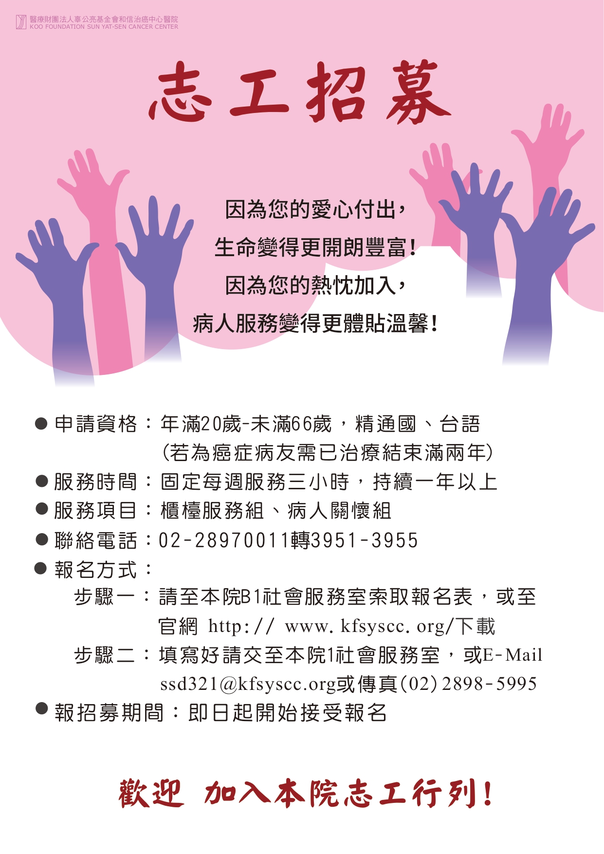 歡迎加入本院志工行列,與我們一同傳遞愛與希望!