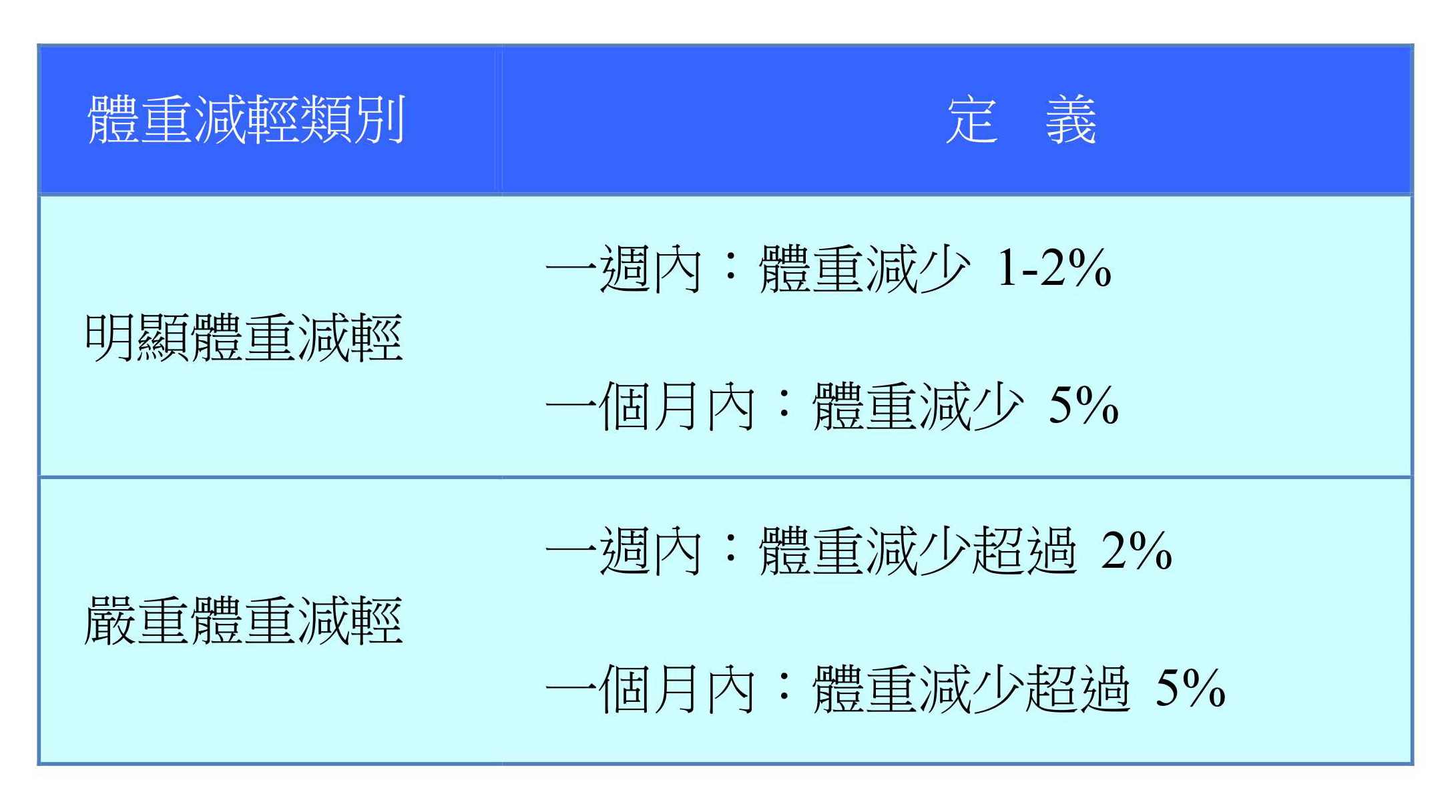 監測治療期間的「體重」,主要在了解病患的營養及抵抗力的狀況。若是營養不良會使體重下降,降低對治療的耐受性,也有可能被迫停止治療,甚至治療效果下降。什麼是體重減輕的定義,如表格說明: