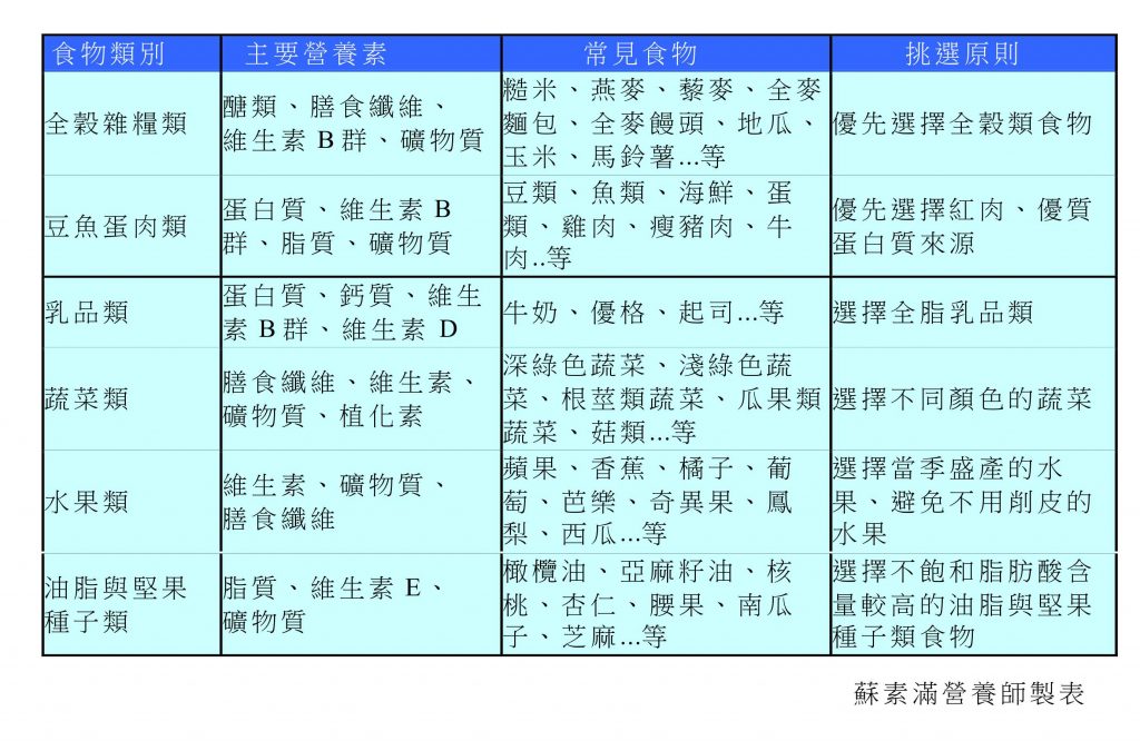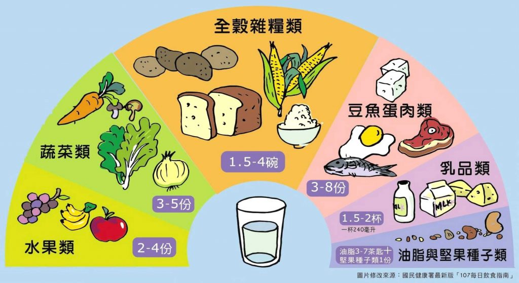 衛福部國民健康署將不同食物,依其營養成分分成:全穀雜糧類、豆魚蛋肉類、乳品類、油脂與堅果種子類、蔬菜類和水果類等六大類的飲食指南,如圖說明: