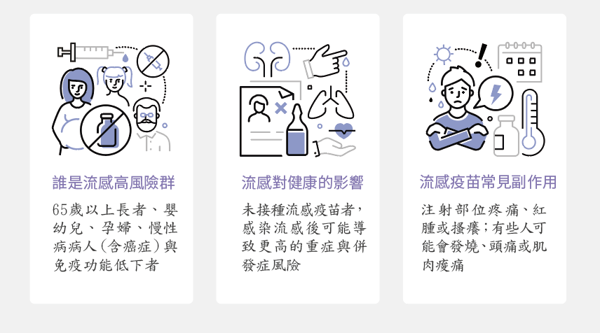 其實,接種流感疫苗並不是只有癌症病人或免疫力差的人才需要,而是6個月以上的所有人都應該完成的基本防護。流感病毒傳染力強、變異快,不論年齡大小、身體狀況如何,都有可能被感染。很多人以為「年輕健康,不怕流感」,但事實上,台灣每年都能看到因流感住進加護病房,甚或不幸離世的個案,其中不乏相對年輕、沒有慢性病的人。