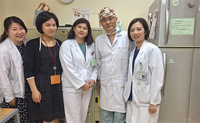 左圖:余本隆醫師(左)、余媽媽(中)與妻子張醫師(右)一家人在美國 。中圖:余本隆醫師與「牽手」張醫師鶼鰈情深。右圖:余本隆醫師(右二)與和信治癌中心醫院醫護團隊。(以上圖片皆由余本隆醫師提供)