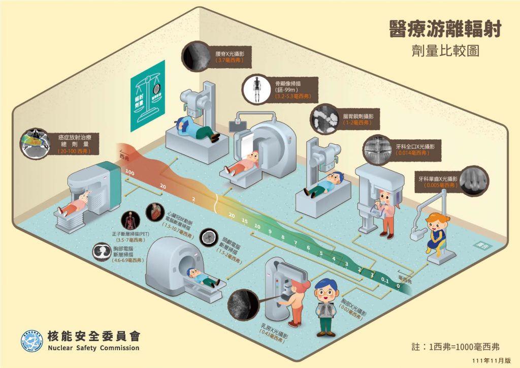 - 放射科的檢查輻射劑量的暴露受到自身體重、脂肪量和身體水分量的影響,每個人都會不一樣,上述數值為大約的劑量。