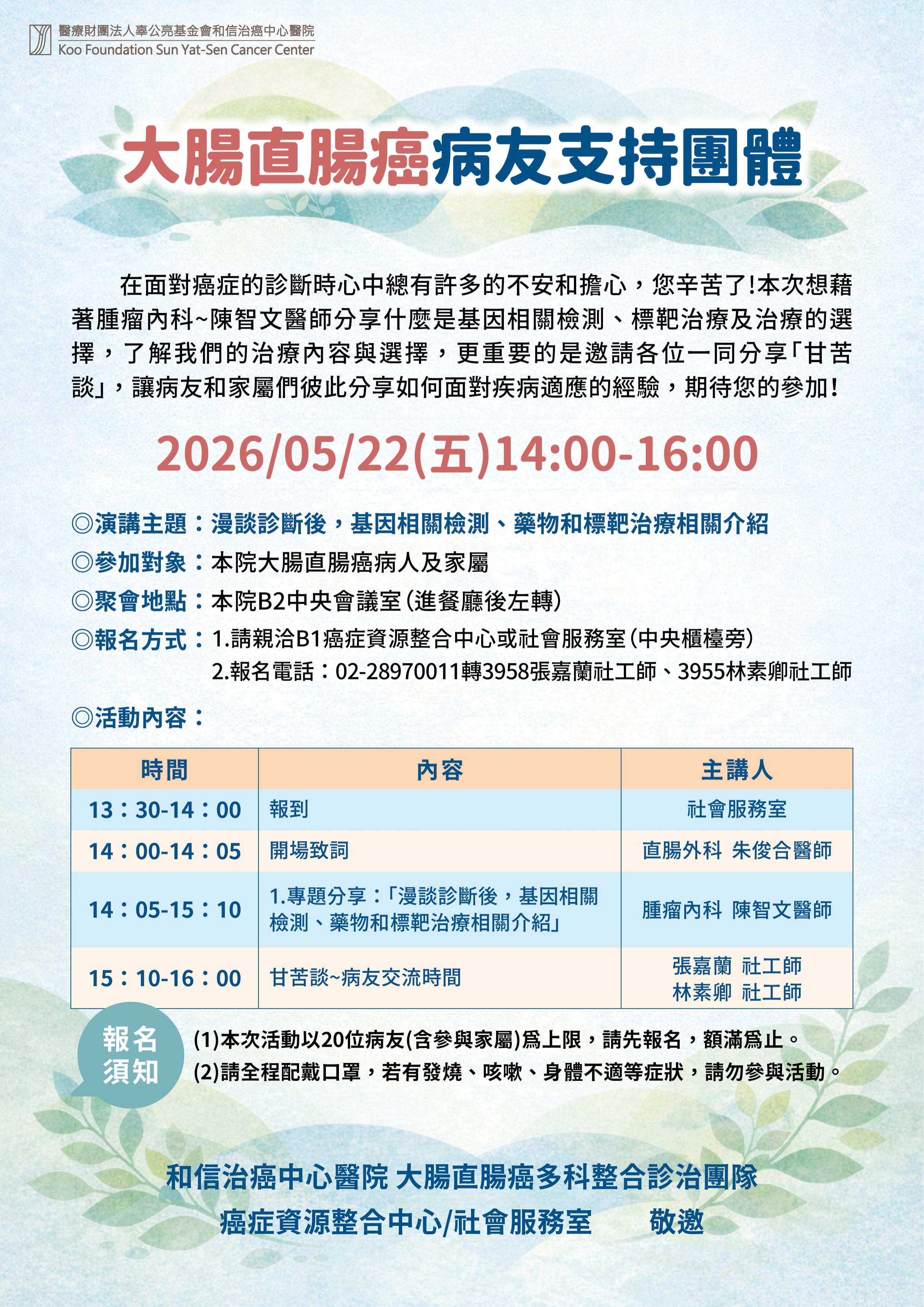 本次活動對象為本院大腸直腸癌病人及其家屬,地點設於院內B2中央會議室。名額以20位病友(含家屬)為限,採事先報名制,額滿為止。報名可親洽癌症資源整合中心或社會服務室,亦可透過電話(02-28970011分機3958、3955)洽詢。