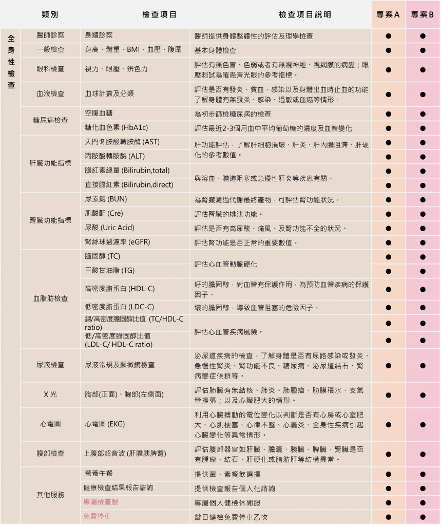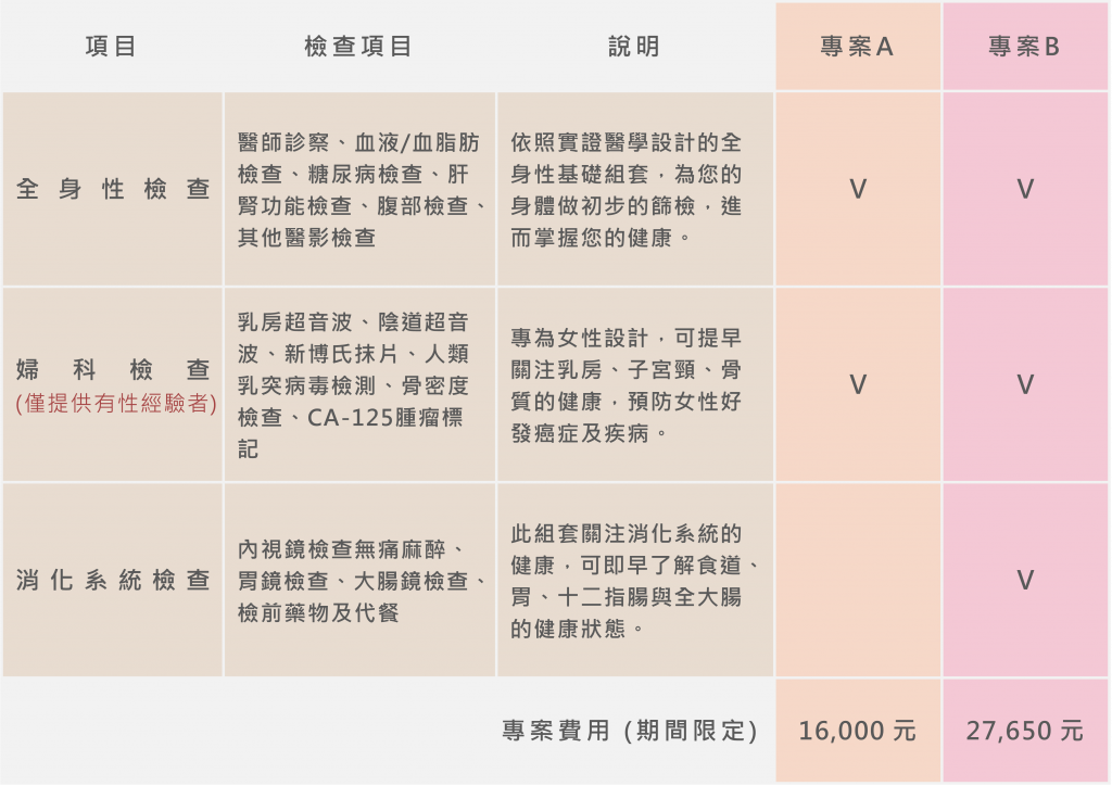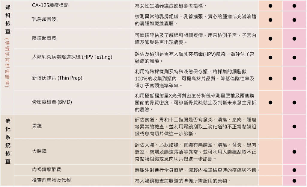 檢查主要包含:全身性定期檢查+婦科檢查、內視鏡檢查無痛麻醉、胃鏡檢查、大腸鏡檢查