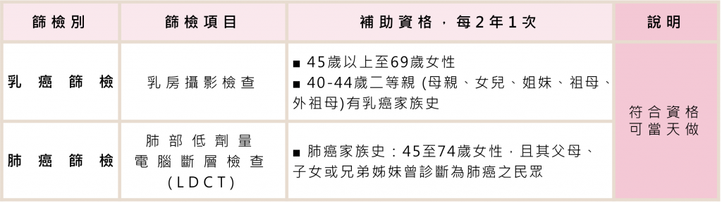 預防癌症的關鍵是早期發現早期治療。目前,政府依照實證建議,針對特定族群提供免費癌症篩檢項目。您可於健檢當日攜帶健保卡,並於報到時主動告知。如您符合資格、即可當日受檢。