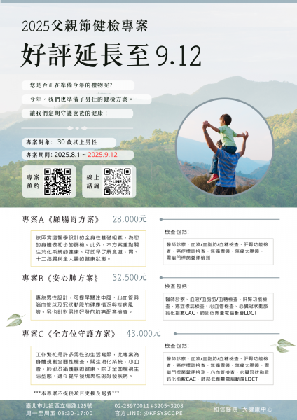 工作繁忙是許多男性的生活寫照,此專案為身體規劃全面性檢查,關注消化系統、心血管、肺部及攝護腺的健康,除了全面檢視生活型態,還可提早發現男性的好發疾病。