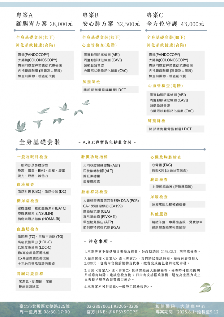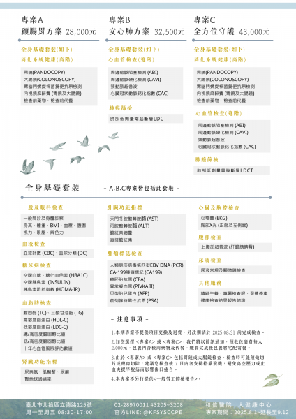 檢查主要包含:醫師診察、血液/血脂肪/血糖檢查、肝腎功能檢查、癌症標誌檢查、無痛胃鏡、無痛大腸鏡、胃幽門桿菌糞便檢測、心血管檢查、心臟冠狀動脈鈣化指數CAC、肺部低劑量電腦斷層LDCT