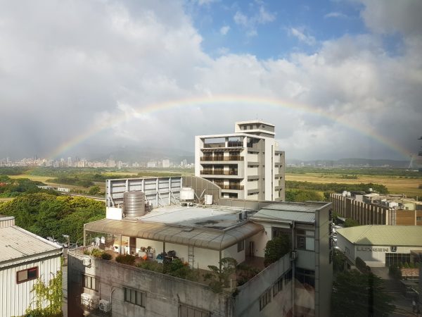 (張醫師和許專科護理師7月17日查訪的午後,窗邊出現了道完整的彩虹,就像這樣美好的際遇般一生中可遇不可求,也感謝因有和信醫院團隊的照顧,,生病及苦厄雨過天晴,病人及家屬的心中感受不但幸福而且溫暖!)