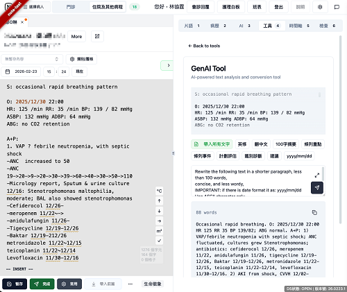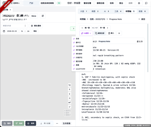 病程紀錄系統上線後,使用人數節節上升,林協霆醫師又開始思考,如何進一步利用AI協助臨床人員的日常工作。「我之前跟著黃國埕醫師學習時,發現他做事非常仔細,查房前會花費大量時間整理與抄寫病人資料,例如抽血報告與生命徵象等。」這些數據固然重要,但抄寫的過程極度耗時。於是他將AI導入查房清單,使醫護人員能一鍵取得「此刻最需要知道的資訊」,大幅簡化工作流程,也降低遺漏重要訊息的風險。