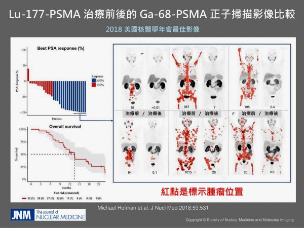由於PSMA PET/CT診斷的進展,也進一步改變攝護腺癌的治療方式,包括體外放射線治療、手術、以及Lu-177-PSMA治療。其中又以Lu-177-PSMA治療最受到期待與矚目,自2014年由Kratochwil C發表的第一篇使用Lu-177-PSMA治療攝護腺癌病人的案例後,相關的臨床試驗開始蓬勃發展,在德國更是大量開始在臨床使用。2018年澳洲Peter MacCallum Cancer Centre的Hofman等學者進行的第二期臨床試驗研究發現,研究中57%的去勢療法抗性病人在經過Lu-177-PSMA治療後,PSA可下降超過50%,而治療的相關副作用大多屬於輕度,因此治療的耐受性相當良好。Lu-177-PSMA用於治療轉移性去勢療法抗性病人的全球性第三期臨床試驗已經在2021年9月正式發表研究結果,證實了此療法能有效延長病人整體存活時間。而不只是β放射性同位素Lu-177使用於治療,使用α放射性同位素如Ac-225結合上PSMA的治療,也陸續在研究中展現效果,PSMA放射性藥物診療的未來發展實令人振奮期待!
