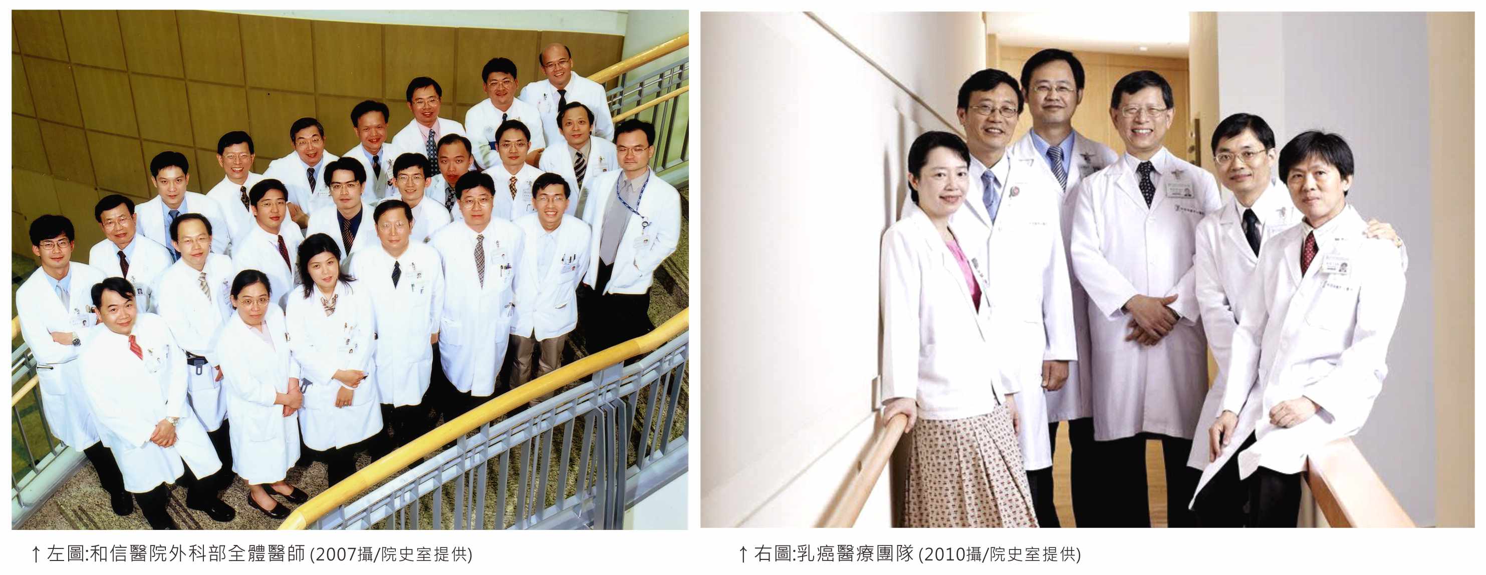 和信醫院成立之初即建立完善的治療團隊。當時乳癌團隊的成員主要由我與放射腫瘤科簡哲民醫師,以及各部門仍在訓練中的年輕醫師組成。臺大麻醉科黃芳彥主任特地帶著彭文玲醫師與護理長陳薇君前來支援。北榮放射診斷科周宜宏主任也經常親自到院協助,在乳房攝影、超音波與切片檢查等方面給予我們極大幫助。