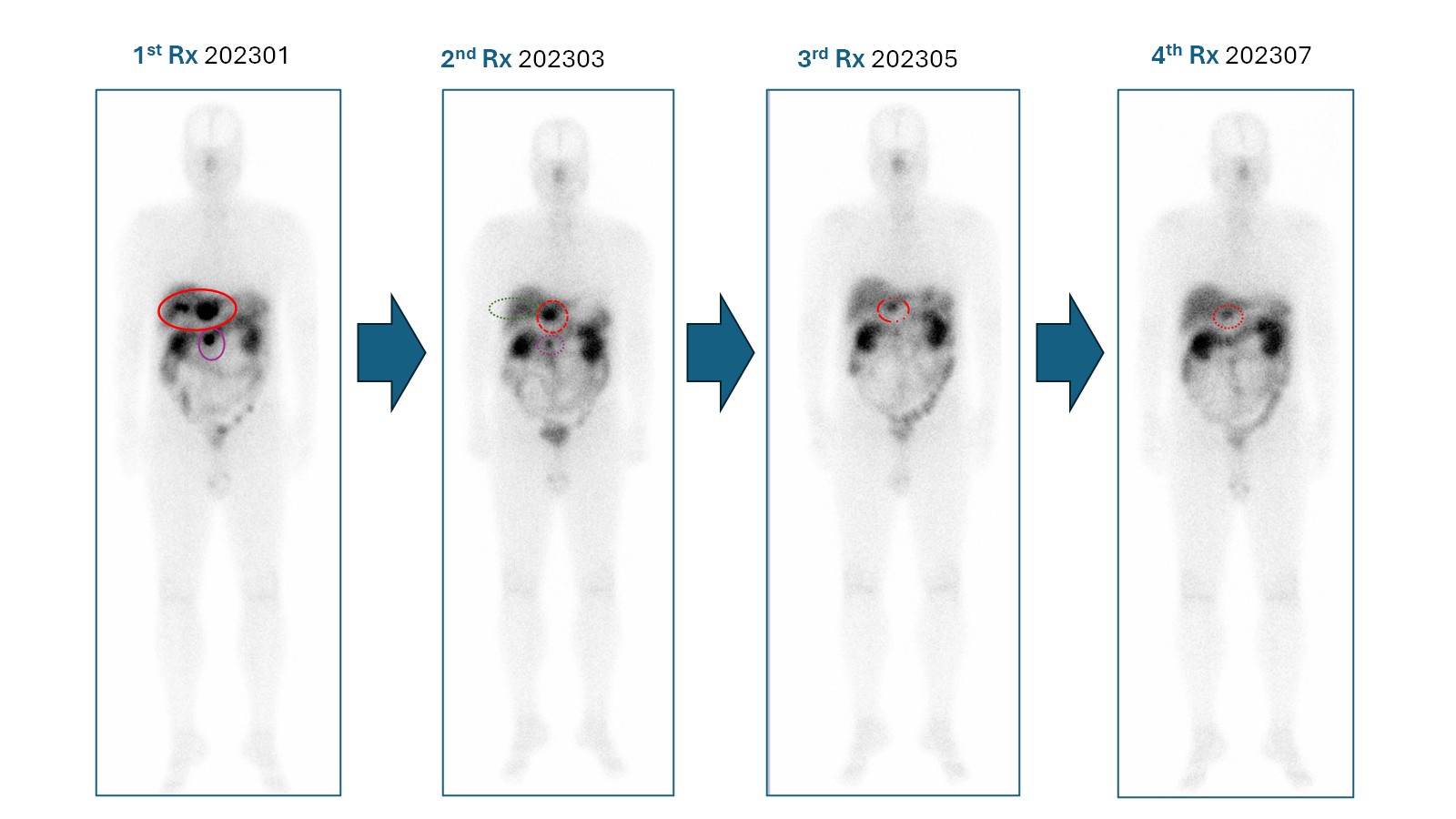 所幸,陳先生在接受PRRT(肽受體-放射性核素治療)後,再輔以手術治療,腫瘤皆已清除乾淨;而沈女士在PRRT治療後,腫瘤指數也全都降至正常,症狀完全改善。兩位病友的生活都恢復正常,只需要定期回門診追蹤即可。和信醫院核子醫學科黃玉儀醫師說明:「PRRT是利用腫瘤細胞具有體抑素受體過度表現的特性,將放射性標記之體抑素受體配體注射至病人體內,具有細胞毒性的放射性藥物會與腫瘤結合,達到毒殺效果。這是一個全身性的治療,通常用於治療難以手術切除或轉移至其他器官的神經內分泌腫瘤。PRRT治療在2023年1月才通過台灣核准,等待通過核准的期間,我們醫療團隊嚴密監控陳先生的病況,進行多次肝臟栓塞和手術控制腫瘤的生長,很感謝陳先生對醫療團隊的信任,與我們合作無間,陳先生成為和信醫院第一位接受PRRT治療的病人,經過8個月的治療獲得非常良好的療效,配合手術介入的治療,目前已達到完全緩解。沈女士接受4次PRRT治療後,CgA指數從2000多一路下降到93,終於回到正常數值範圍內,她也不再感受到之前生病的那些症狀,完全恢復正常生活。」